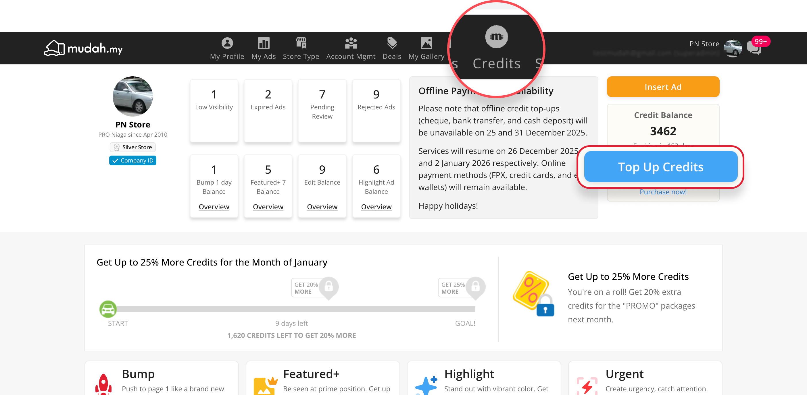 To buy Mudah Credits, first, log in to your PRO Niaga account. Then, click on 'Credits' at the top of the page.